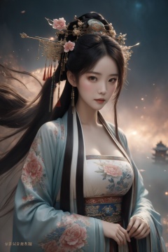 chang,floral print,(cleavage:0.7),long sleeves,fantasy theme,chines style,1girl,masterpiece,best quality,Light master,upper body,flower,hair ornament,Nebula,BY MOONCRYPTOWOW,tq,ajkds,tutultb,chijian,looking at viewer,east asian architecture,after destruction:0.5,Slavic typography,by artgerm,Enoch Bolles+Ross Tran+Greg Rutkowski,