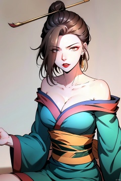 masterpiece,(the best:1.1),wallpaper,8K,absurdres,a high-resolution,superdetailing,larry's skin,high detail skin,beauty face,PERFECT FACE,white skin with light,detailed skin,clear focus,the best,(bust:1.1),upper_body,solo,medium breasts,open your legs,looking at viewer,dynamic photo,japanese clothes,breasts,kimono,makeup,cleavage,sash,white background,lipstick,bare shoulders,off shoulder,simple background,kiseru,hair ornament,wide sleeves,obi,looking at viewer,side slit,hair stick,hair over one eye,earrings,brown hair,,front view,sitting,white_background,