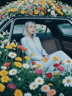 1girl,A young girl with white hair sitting in car filled with flowers,art by Rinko Kawauchi,in the styleof naturalistic poses,vacation dadcore,youth fulenergy,a coolexpression,body extensions,flowers in the sky,analog film,super detail,dreamy lofiphotography,(colourful),covered in flowers anovines,(Inside view),shot on fuiifilm XT4,Inside car,colourful_flower,a large number of flowers grow inside the car,a scene full of illusions,