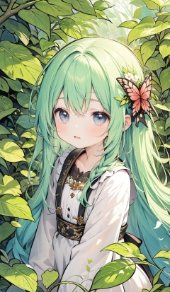1 girl, surrounded by big leaf plants, wearing flower accessories, (Old-growth forest), (long hair) puberty, young girl, bright outline,Butterfly Dance, chibi, surrealistic,tuyawang, senlin