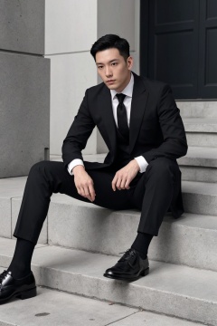 1man,male focus,asian,exquisite facial features,handsome,deep eyes,muscular,suit,pants,(black sheer socks,footwear:1.2),solitary and mysterious atmosphere,graceful yet melancholic posture,full shot,dutch angle,from_side,medium_shot,dramatic,Tyndall effect,(masterpiece, realistic, best quality, highly detailed, Ultra High Resolution, Photo Art, profession),jzns,br, jzns