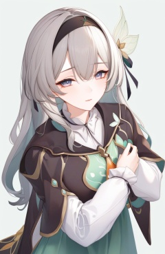 liuying,bangs,long sleeves,hair ornament,black jacket,black hairband,high quality,green dress,grey hair,<lora:流萤xl2:1>,, (masterpiece,best quality:1.2),absurdres, high quality,