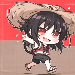 <lora:bichi style:1>,bichi style,1boy,monkey d. luffy,solo,male focus,straw hat with red edge,black hair,sandals,running,shorts,open mouth,smile,simple background,scar,black eyes,red background,chibi,