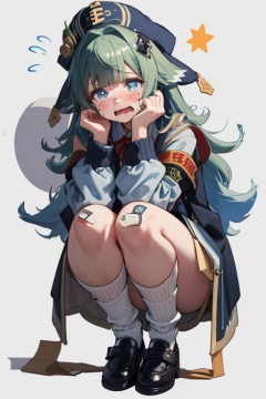 <lora:huohuo:1>,huohuo \(honkai star rail\), 1girl, solo, long sleeves, bandaid on knee, full body, hands on headwear, very long hair, shoes, tears, looking at viewer, knees together feet apart, flying sweatdrops, blush, wavy mouth, blue headwear, white socks, black footwear, arms up, knees up, loose socks, jacket, parted lips, tearing up, squatting, open mouth