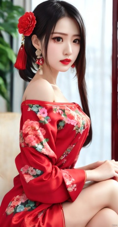 1girl,hair ornament,solo,flower,hair flower,candle,earrings,jewelry,black hair,black eyes,blurry,lips,red lips,looking at viewer,tassel,depth of field,makeup,realistic,(red_clothes:1.3),chinese clothes,floral print,upper body,medium breasts,off-the-shoulder,sitting, ylj-hd, yanlingji