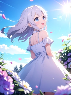 (best quality),((masterpiece)),fisheye,((from above,from behind)),(very wide shot),summer,(lens flare),flower field,cinematic lighting,ray tracing,depth of field,(blurry foreground),(chiaroscuro),cowboy shot,horizon,1girl,white dress,white hair floating in the wind,(looking back),:d,blue eyes,happy,(blue sky, cloudy sky),petals,bird,feather,