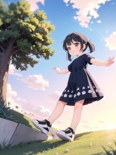 (best quality),((masterpiece)),((cute 1 girl:1.2)),(child,8 years old:1.4),low twintails,hair,solo,outdoors,cloud,black hair,dress,white footwear,red sky,shoes,short sleeves,sneakers,looking at viewer,brown eyes,white dress,full body,(dynamic pose:1.3),day,cloudy sky,floral print,bangs,blue sky,grass,blush,tree,closed mouth,city,from below,running,