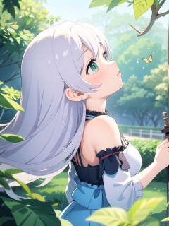(best quality),((masterpiece)),1girl,white hair,green eyes,looking up,floating hair,butterfly,from side,wings,nature,