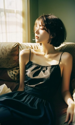 The style of marianna rothen, Contemporary photography, a lazy and carefree lovely girl, 18years old, with short hair, smoking on the sofa, dressed in a black dress, exudes an artist's temperament. in the style of fujifilm fujicolor c200, redpetzval 85mm f/ 2. 2, dreamy