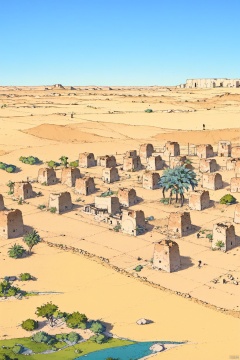 A Tranquil Oasis in a Desert, Filled With Casbahs and Date Palms Surrounded by a Crystal Clear Lake and the Blue Sky Above" or "An Ancient City in a Barren Desert, Surrounded by Small Dunes and Stretched Ruins, with a Bustling Oasis in The Distance Featuring
