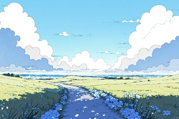 paradise, where clouds fuse into an ambrosial canvas painted in a softer hue of blue and white, with soft blooming flowers and green grass lining your path.