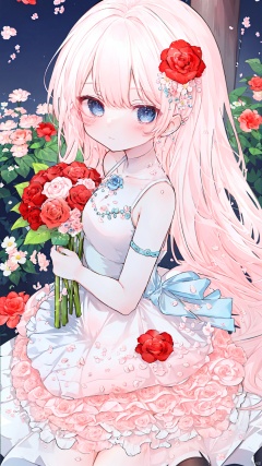 solo, 1girl, dress, flower, blue eyes, looking at viewer, long hair, hair ornament, white dress, hair flower, holding, bangs, white hair, bouquet, armlet, pink flower, sleeveless dress, bare shoulders, from side, sleeveless, holding bouquet, outdoors, breasts, rose, blush, closed mouth