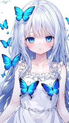 1girl, solo, long hair, looking at viewer, blush, bangs, blue eyes, dress, bare shoulders, collarbone, upper body, white hair, frills, parted lips, signature, white dress, bug, butterfly, blue butterfly