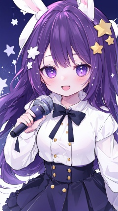 1girl, solo, long hair, looking at viewer, blush, smile, open mouth, bangs, hair ornament, hat, holding, animal ears, purple eyes, purple hair, teeth, virtual youtuber, star \(symbol\), rabbit ears, microphone, holding microphone, rabbit hair ornament