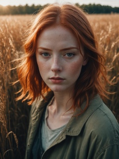 cinematic film still, close up, photo of redheaded girl near grasses, fictional landscapes, (intense sunlight:1.4), realist detail, brooding mood, ue5, detailed character expressions, light amber and red, amazing quality, wallpaper, analog film grain