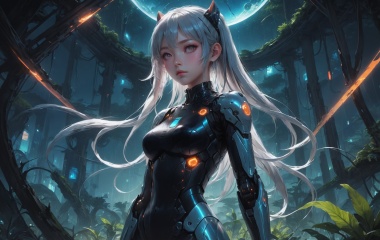 anime style, 1girl, blunt bangs, high ponytail, silver hair, pointy ears, in the depths of a bioluminescent alien jungle, [evangelion:cyberpunk edgerunners:0.5], reflective transparent iridescent opaque clothing, long sleeves, flowing dress, long skirt, very aesthetic, highres, 4k, 8k, intricate detail, cinematic lighting, amazing quality, amazing shading, detailed Illustration, official artwork, wallpaper, official art, extremely detailed eyes and face, beautiful detailed eyes, from below, full body, thigh gap, <lora:aesthetic_anime_v1s:1>