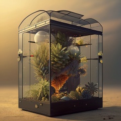 (realistic:1.2), (intricate:1.3),analog style, (film grain), (warm hue, warm tone:1.2), close up, cinematic light, sidelighting, ultra high res, best shadow, RAW, (tropical jungle) , (KnollingCaseQuiron style), glass case, display case, (KnollingCase:1.4),