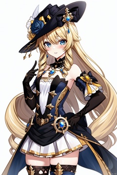 1girl, solo, long hair, looking at viewer, blush, bangs, blue eyes, blonde hair, simple background, thighhighs, gloves, hat, white background, dress, bare shoulders, jewelry, very long hair, flower, cowboy shot, earrings, small breasts, parted lips, detached sleeves, elbow gloves, black thighhighs, white gloves, zettai ryouiki, black headwear, rose, drill hair, hat flower