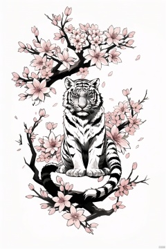 qzhsws, no humans, tiger, flower, white background, branch, traditional media, animal focus, year of the tiger, cherry blossoms, simple background, full body, pink flower, animal