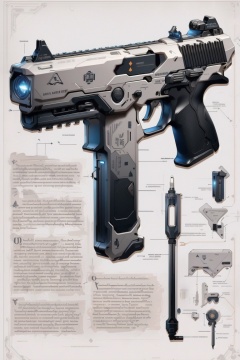 ((HRD, HUD, 8K)),((masterpiece, best quality)), highly detailed, photo_\(medium\),GameWeapon, no humans, science fiction, english text, simple background, white background, fantasy, concept art, from side, multiple views, grey background, arrow (symbol), weapon, gun,  <lora:20240218-1708226210017:0.9>