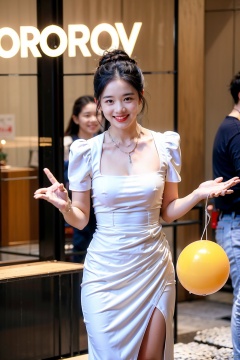 1girl, solo, looking at viewer, smile, black hair, dress, jewelry, teeth, necklace, white dress, grin, black eyes, makeup, lipstick, realistic