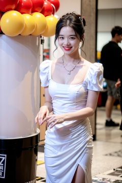 1girl, solo, looking at viewer, smile, black hair, dress, jewelry, teeth, necklace, white dress, grin, black eyes, makeup, lipstick, realistic