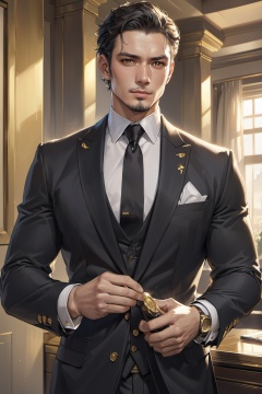 masterpiece,best quality,1man,realistic anime art style,black,gold,suit
