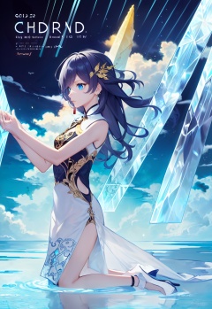 simple_white_background,golden and white theme,Sense of coordination,sense of order,mathematics beauty,(cover design),(cover art),((trim)),album_art,official art,(Master's work),full body,( closeup, 1girl,solo:1.2),<lora:qingyan-v100-000022:0.8:lbw=OUTALL>,qingyan,1girl,fu hua,chinese clothes,blue eyes,short china dress,lhair ornament,black hair,bangs,bare hands,sleeveless,blue eyes,cloud,sky,leaf,Cloud patterns,Chinese pattern,white geometry,colorful geometry,reflection,crystal_art,pattern_design,creative,Mystery pattern,colorful crystal decorate,blue crystal,(architectural art),((geometric art)),pattern design,creative,shine,dream,fly in sky,swim in cloud,------,Low saturation,grand masterpiece,Perfect composition,film light,light art,