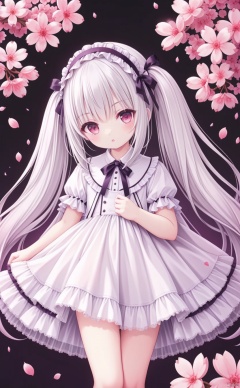 masterpiece,best quality,very long hair,cowboy shot,moinszero,moinszero,moinszero,moinszero,moinszero,moinszero,moinszero,moinszero,1girl,long_hair,solo,dress,very_long_hair,lolita_fashion,hairband,flower,cherry_blossoms,petals,looking_at_viewer,lolita_hairband,white_hair,frills,num18,twintails,