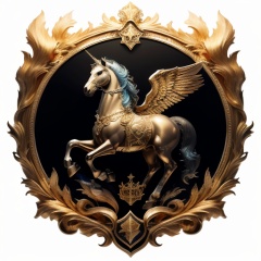 <lora:graphic badge:1>,(graphic badge:1.3),no humans, wings, black background, crown, unicorn, watermark, simple background, solo, gold, pegasus, gem, full body, artist name, web address, feathered wings, animal focus, single horn, horse, animal