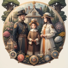 <lora:graphic badge:1>,(graphic badge:1.3),art,person,illustration,man,stand,poster,picture,group,woman,drawing,circle,couple,house exterior,color,photo,family,image,house,hat,festival,design,style,wear,draw,surround,tree,pose,frame,flower,bright,