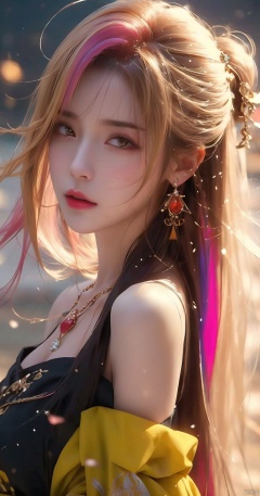 1girl,Bangs, off shoulder, colorful_hair, ((colorful hair)),golden dress, yellow eyes, chest, necklace, pink dress, earrings, floating hair, jewelry, sleeveless, very long hair,Looking at the observer, parted lips, pierced,energy,electricity,magic,tifa,sssr,blonde hair,jujingyi, wangyushan, dofas