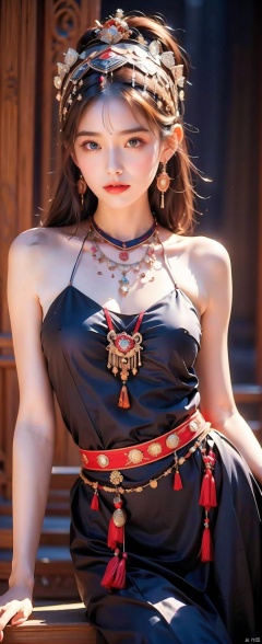 leogirl, seductive leaning forward detailed skin, ultra realistic 8k cg, picture-perfect face, flawless, clean, masterpiece, professional artwork, famous artwork, cinematic lighting, cinematic bloom,(( brown_eyes, brown_hair, )),(1girl, beautiful girl),perfect face, (young:1.1),((fit figure)),((25 year old)), beautiful face, beautiful blue eyes,detail eyes, detail face, (((perfect female body, ))),(large breasts:1.2), (girl,Hmong clothing,Silver headdress,dress,bare shoulders,jewelry,pose,necklace,black dress,bracelet,silver jewellery,night,dark,long legs,navel,),
