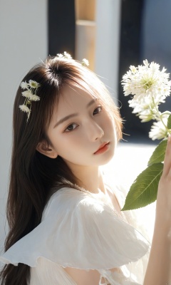 8K,raw,1girl,white flower, sunlight, HUBG_Beauty_Girl,