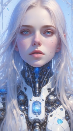 BJ_Cyber_albinism, 1girl, solo, long_hair, blue_eyes, closed_eyes, upper_body, parted_lips, lips, freckles, science_fiction, nose, android, mechanical_parts,photo,8k,intricate,highly detailed,majestic,digital photography,broken glass,(masterpiece, sidelighting, finely detailed beautiful eyes:1.2),hdr,realistic,high definition,. Dreamlike,mysterious,provocative,symbolic,intricate,detailed,<lora:SDXL_Cyber_albinism_V1:0.7>,