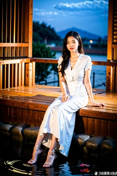 1girl, (best quality, masterpiece, ultra-high resolution, 4K, HDR, UHD, 64K, official art), (photorealistic:1.3, realistic:1.3),depth of field, outdoors, (night:1.3), (dim light), (onsen:1.2, flower arrangement:1.2),floating hair, long hair, dark brown hair, (full body:1.3), arms at sides, seductive pose, (wedge heels), (sitting:1.3), (large breasts), (solo_focus:1.2), looking_at_viewer,(fit and petite body, busty), (curvy:1.2), (under the water), (wet hair, wet shirt), (sitting in water), long dress