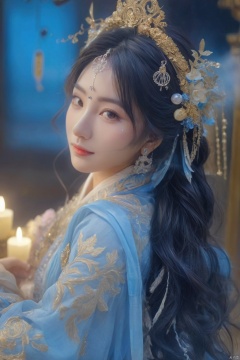 HUBG_Rococo_Style(loanword), 1girl, hanfu, Portrait of noble and graceful goddess, dressed in blue and gold, elaborate coiffure hairstyle, dark hair, decoration, 16K, UHD, HDR, Brilliant scene with bright lights, mist, numerous decorations, joyful atmosphere, light smile,HDR, IMAX, 8K resolutions, ultra resolutions, magnificent, best quality, masterpiece,cinematic scenes, cinematic shots, cinematic lighting, volumetric lighting, ultra-detailed,