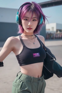 a award winning half body portrait of a beautiful girl in a croptop and cargo pants with ombre purple pink teal hairstyle with head in motion and hair flying listenin to music on headphones by wlop, paint splatter, outrun, vaporware,HDR, IMAX, 8K resolutions, ultra resolutions, magnificent, best quality, masterpiece,cinematic scenes, cinematic shots, cinematic lighting, volumetric lighting, ultra-detailed,