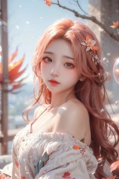 bubble,1girl,sweater,white background,Off Shoulder,blurry background,orange flower, orange sky,pinktheme,autumn,autumn leaves,dusk,embers,fiery hair, (\meng ze\)