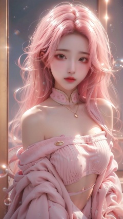 bubble,pink hair,High quality, masterpiece, Portrait,cinematic texture,1girl,sexy_sweater, navel,Scarf,Off shoulder, (\meng ze\)