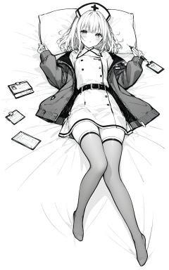 (masterpiece),(best quality),1girl,nurse cap,thighhighs,hat,nurse,monochrome,greyscale,jacket,looking at viewer,lying,on back,blush,pillow,belt,full body,medium hair,traditional media,open clothes,open jacket,sketch,off shoulder,dress,id card,syringe,bangs,no shoes,long sleeves,