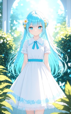 (masterpiece),(best quality),illustration,ultra detailed,hdr,Depth of field,(colorful),loli,wide shot,(depth of field),global illumination,soft shadows,backlight,lens flare,((colorful refraction)),((cinematic lighting),looking outside,with butterfly,1girl with lightblue long hair and blue aqua eyes,hair flowers,hime cut,sunlight,blurry background,blurry,garden,White Dress,,