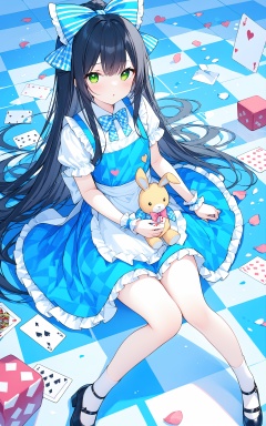 masterpiece, best quality, 1girl, long hair, green eyes, checkered floor, stuffed toy, stuffed animal, solo, dress, black hair, bow, hair bow, playing card, card, stuffed bunny, petals, looking at viewer, blush, wrist cuffs, blue dress, apron, short sleeves, heart, frills, sitting, bangs