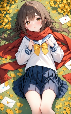 masterpiece,best quality,loli,1girl, solo, school uniform, skirt, scarf, lying, serafuku, on back, long sleeves, autumn, blue skirt, looking at viewer, sailor collar, bow, brown eyes, long hair, tears, autumn leaves, bangs, blue sailor collar, shirt, parted lips, pleated skirt, white shirt, envelope, ahoge, blurry, red scarf, black hair, crying, leaf, letter, crying with eyes open, yellow bow, outdoors, brown hair, bowtie, ginkgo leaf, from above, tearing up, blush