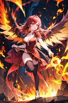 (best quality), (masterpiece), 1girl, bracelet, breasts, breathing_fire, burning, cleavage, dress, explosion, fiery_hair, fiery_wings, fire, flame, flaming_sword, flaming_weapon, full_body, jewelry, long_hair, magic, molten_rock, open_mouth, orange_eyes, phoenix, pyrokinesis, red_dress, red_eyes, red_hair, tail-tip_fire, thighhighs, torch, white_legwear