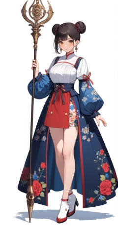 (best quality), ((masterpiece)), (highres), illustration, original, extremely detailed,1girl, solo, double bun, hair bun, holding, earrings, jewelry, white background, black hair, long sleeves, full body, simple background, looking at viewer, standing, staff, puffy sleeves, polearm, floral print, puffy long sleeves, shoes, white footwear, brown eyes, holding staff, blush, rose print, shirt, weapon