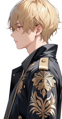 (best quality), ((masterpiece)), (highres), illustration, original, extremely detailed,1boy, solo, male focus, blonde hair, white background, simple background, upper body, short hair, long sleeves, from side, black jacket, closed mouth, bangs