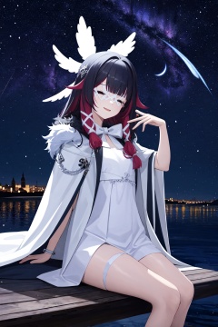 <lora:少女v2-000010:1>,shaonv,1girl,solo,white mask,head wings,fur-trimmed coat,smile,white coat,white bow,white dress,white ribbon,aurora,city lights,cloud,crescent moon,fireflies,horizon,light particles,milky way,moon,night,night sky,shore,sitting,sky,skyline,snowing,space,star \(sky\),starry background,starry sky,twilight,water,, (masterpiece,best quality,high quality:1.2),absurdres,