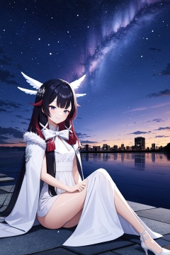 <lora:少女v2-000006:1:lbw=char>,shaonv,1girl,solo,white mask,head wings,fur-trimmed coat,smile,white coat,white bow,white dress,white ribbon,aurora,city lights,cloud,crescent moon,fireflies,horizon,light particles,milky way,moon,night,night sky,shore,sitting,sky,skyline,snowing,space,star \(sky\),starry background,starry sky,twilight,water,, (masterpiece,best quality,high quality:1.2),absurdres,