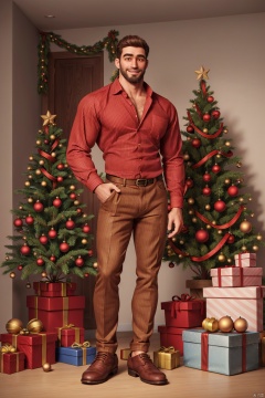 1man,facial hair,full body,looking at viewer,smile,red striped shirt,collared shirt,long sleeves,brown pants,shirt tucked in, leather shoes,hand in pocket,standing,christmas, christmas eve, christmas house, 1Man, realism